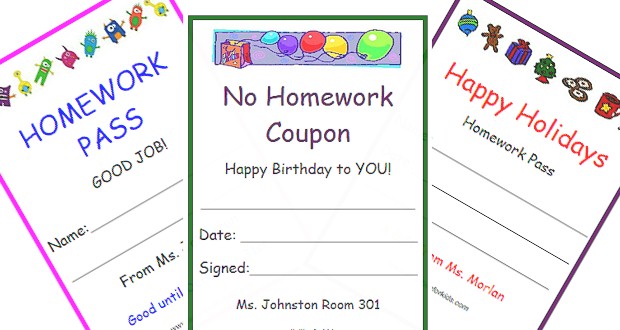 You will win major cool points with your class and all you have to do is print and . Support for higher teacher salaries. Had a birthday, i gave you a birthday pass. Download and print this free printable homework pass today! Did something above and beyond? Reward students for a job well done with a get out of homework free card! Sometimes even the best pupils forget to do their homework or have too much . Be everyone's favorite teacher with this no homework pass! Holiday & christmas homework passes! No homework passes (4 per sheet). This makes a fantastic addition . Gift it to your students as part of your christmas gift to them! Good football/soccer drills to do alone.